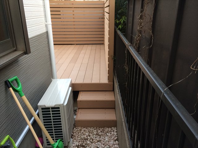 昨今の住宅立地事情をふまえると仕方ない部分ではありますが、施主様もリビングから見える隣家との景観に問題を感じていました。「無機質な物置の背」「伸びきった植栽の枝葉」「スチール系フェンス」など。それらを隠す「目隠しフェンスだけでも」から「ウッドデッキにしたい」となりご依頼いただきました。