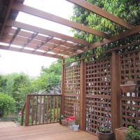 パーゴラは施主様ご希望で藤棚風ウリン12cm幅の格子組、施工はでは難しい格子です。