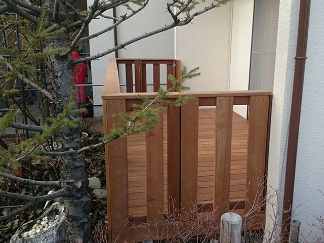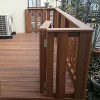 ウッドデッキの面積(3.5×1.9メートル)やフェンスの高さ(80センチ)などの寸法は「今までと同じ」とのご希望でしたので使用木材の幅の違いなどのありますが合わせることができました。今まで室外機は、デッキが切り抜かれ直置きになっていましたが、デッキの床に乗せることで見た目もスッキリしました。