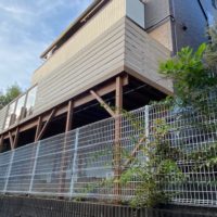 法面で尚且つ家の躯体に固定できない条件でいかに安心できるウッドデッキを施工する難しいケースです。