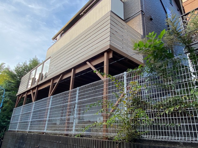 2021年10月東京都練馬区で施工したウッドデッキのご紹介です。ウッドデッキは通常家に固定して施工することでより安定度をますものですがハウスメーカーによっては固定は絶対不可のケースも多くあります。こちらの施工事例も家に固定できないため完全自立型のウッドデッキを施工する事になりました。傾斜のある庭で家に固定できないので施主様は経験の豊富な専門施工業者を探しておりました。それでも適当な業者が見つからずハウスメーカーの紹介で施工にいたりました。