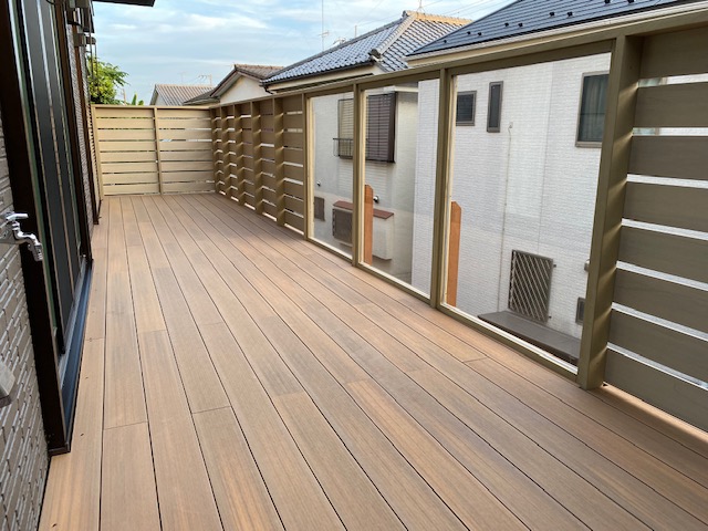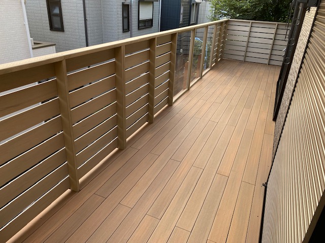 今回の施工の大きな特徴はデッキ正面に厚さ10mmの透明なポリカーボネートの板を貼り開放感のあるデザインにしたことです。ポリカ―ボネートは素材としてはかなり高額ですが耐久性や強度は最強です。それ以外の目隠しフェンスは弊社オリジナルのアールウッドの白系アビスを使用しました。あえて明るめのフェンスにすることで部屋の中からみた印象も明るくなります。そしてデッキの色はよりナチュラルな質感のアールウッドのチークを使っております。今回は施主様の強いご要望もありこのデザインが採用されました。そして構造部は勿論最強のウリン材を使用してますので新築のお住まいに相応しい耐久年数がございます。