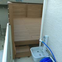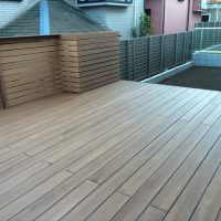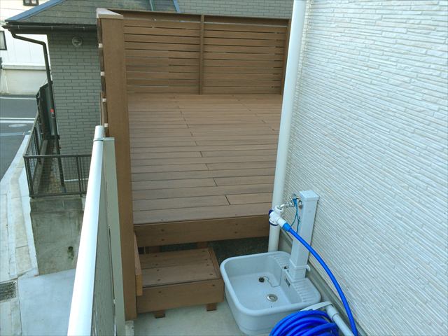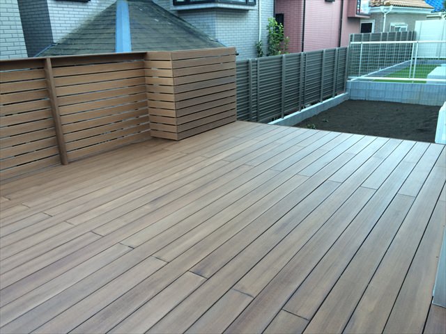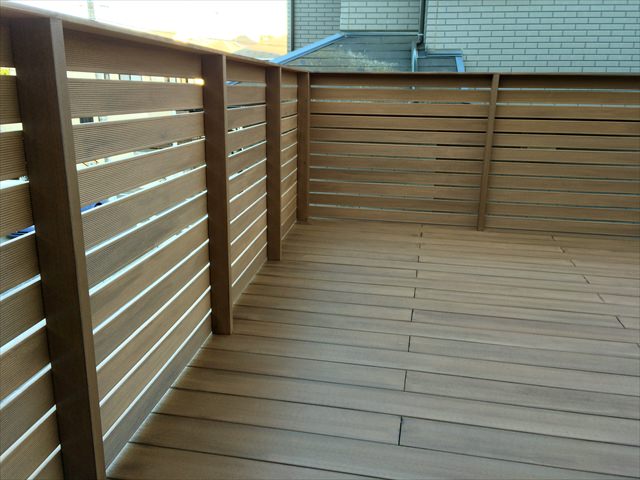 5×3.5メートルと有効範囲が広がる大きさとしては十分なスペースになります。床やフェンスは、ささくれがない人工木材(アールウッド)を選択いただきました。ベージュ色にダークブラウン系の塗装を施すことでより「木」の質感に似ることが気に入っていただけました。