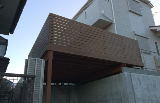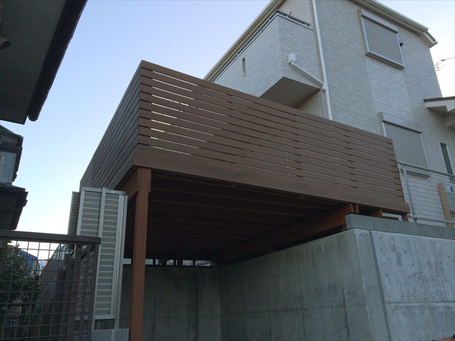 新築戸建て住宅で、駐車場上のデッドスペースをウッドデッキにする前提の土地割りがされている所へのご依頼となりました。擁壁部分に柱材を設定できるようになっているため、長材を通常施工より使用しないので価格も抑えられることとなり…..