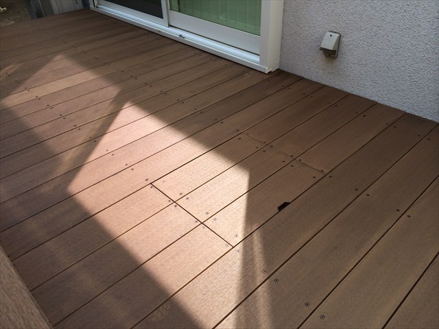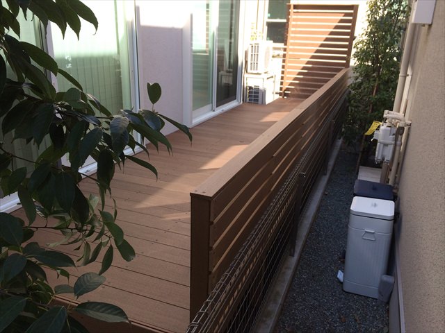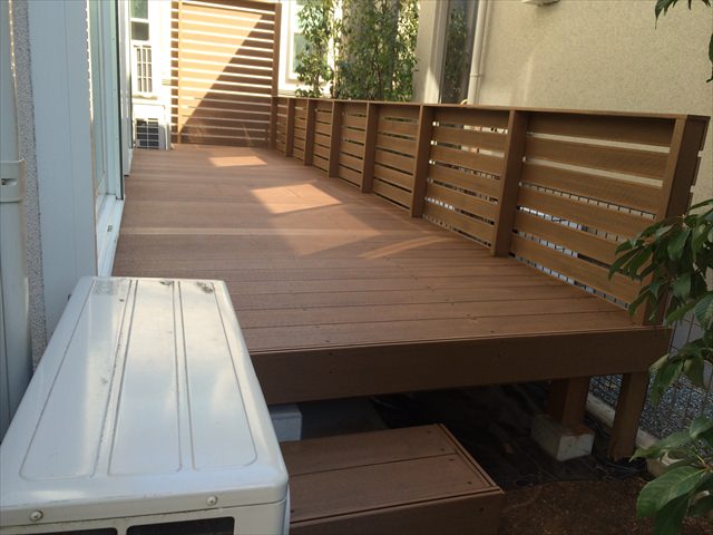 サイズとしては、1.8×7メートル弱と大きく使えるお庭でしたので、植栽を伐採し、遮られた日差しが入るようになっただけでも、広さと明るさを感じます。今回の人工木材(アールウッド)のベージュ色はフローリングに近い色味ということもありますが、庭の明るさを取りたい箇所では、より効果を発揮しています。