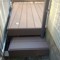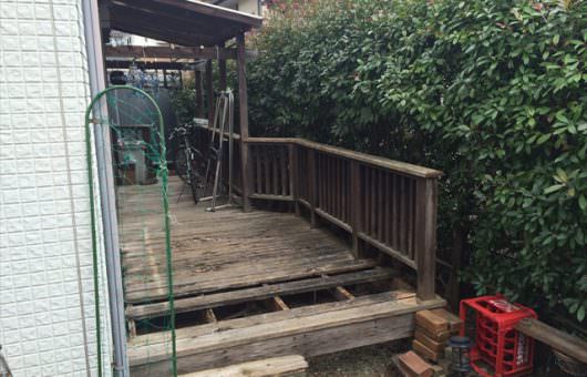 腐る材料を使われているウッドデッキで10年以上経過して、なお形を維持しているのは、防虫・防腐剤入りの塗装処理をしたりして手入れをされていたからだと思います。同時に、手入れをしても成長を続ける植栽が隣家との目隠しになってはいますが、うっそうとして暗い感じとなっていました。