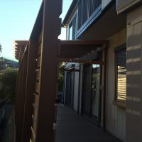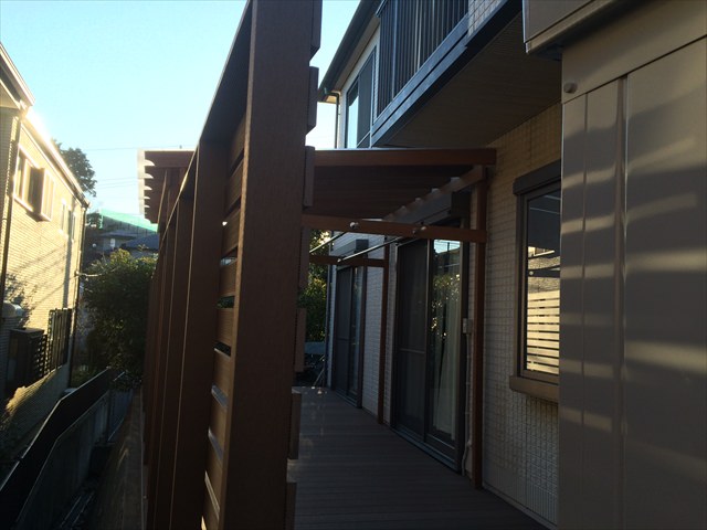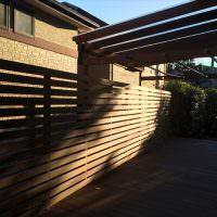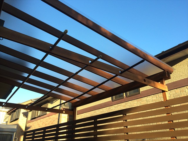 既存のデッキにもあったポリカーボネート平板を付けたパーゴラを設定して、今までと同様に洗濯物を干す事ができるようにしています。屋根があることで突然の雨にも対応しているので人気があります。ポリカボネートは透明なので明るさが変わりません。