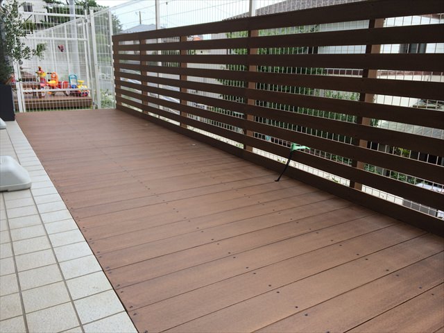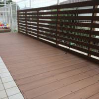 タイルから延びるデッキの床板とフェンスともに、人工木材(アールウッド)で施工しています。タイルから切り替わる部分に段差を付けていないので、使いやすさは向上しています。