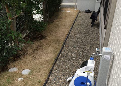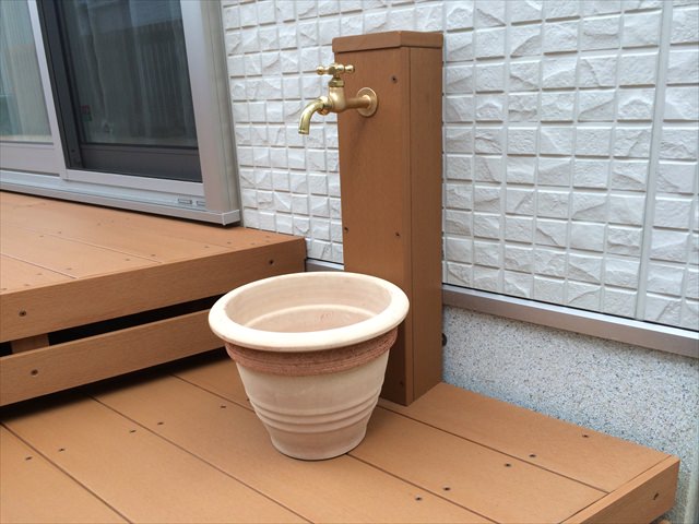 水洗処理に関しては、同じ人工木材で立水栓を作り、排水受けを同色系のテラコッタを設置することで、通常のプラスチック水洗より見た目もグレードアップしています。