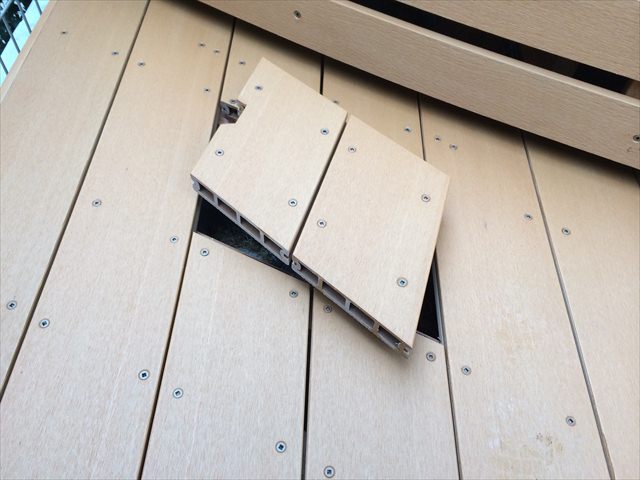 デッキの一部を蓋加工することで、地面にある雨水ますなどに万が一があった時に対応できるようにしています。