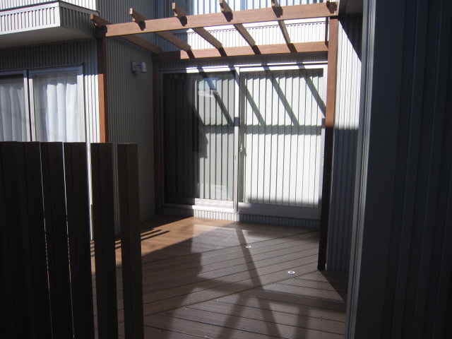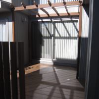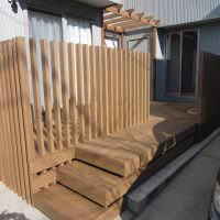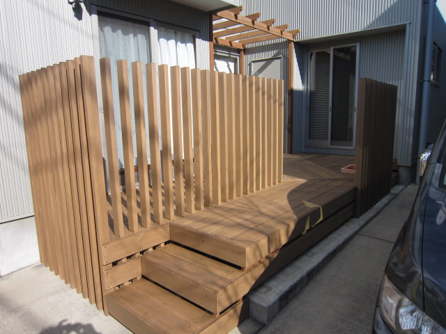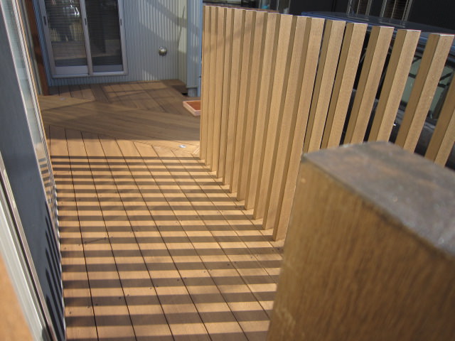 施工例は当初使われていたウッドデッキのアプローチが古くなり 玄関でもあるのできれいにリフォームしたいとご相談をうけました。 玄関まではこの動線を使うので手前の部屋の目隠しの柱フェンスと 奥の部屋の目隠しの柱フェンスを設置…..