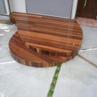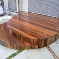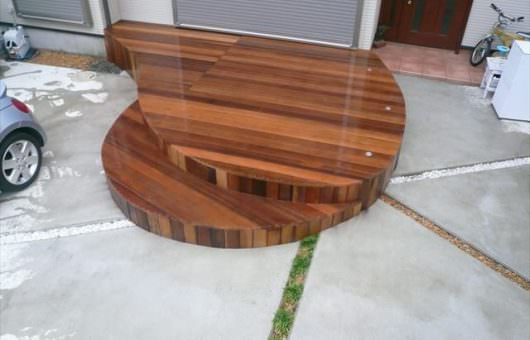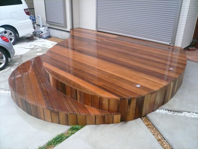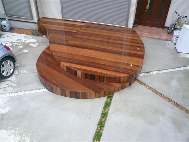 施工例は玄関先に面した目立つ場所の為 なにか他とは違う面白いご提案がないかと考え 角のない円形デッキを施工しました。 材質は加工性のよいイタウバ材を使用し、 幕板は質感とデザイン性がよい縦貼りに 一段下がったステップもデ…..