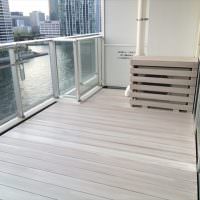 真新しいマンションのベランダでもグレー色の防水層が目立っていますが、白系塗装を施したデッキを敷き詰めることで、統一感が出ました。
