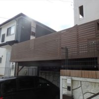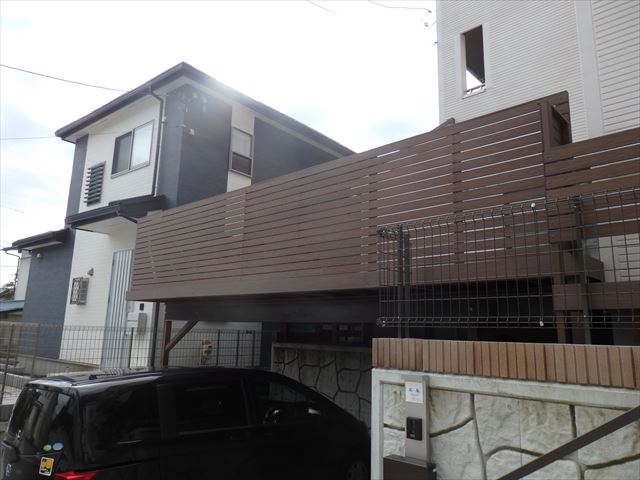 こちらの施工例のお客様はお住まいのご購入計画とほぼ同時に弊社にご相談され、駐車スペースに支柱のない構造でウッドデッキを希望されました。そこで弊社の鉄骨梁システムの採用を検討し今回の施工にいたりました。デザインは特にこだわりなく飽きのこないシンプルなものにしました。シンプルでも十分な質感がある。それが第三世代のアールウッドです。勿論樹脂木ですので変色して白木化することもありません。駐車スペースも中間に柱がないので車が2台余裕で止められます。