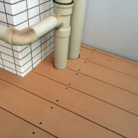 マンションベランダデッキを人工木材(アールウッド)で施工した例です。初めからの「フローリングの高さに合わせる」がご希望でした。構造材と床の高さの調整でフローリングの高さに合わせることは容易です。しかし、マンションのベランダには排水用の勾配がついています。床全面を平衡に保つため有効な束位置を決め、各点でミリ単位で束を切り揃える作業を現場合わせで行うことで可能にしています。