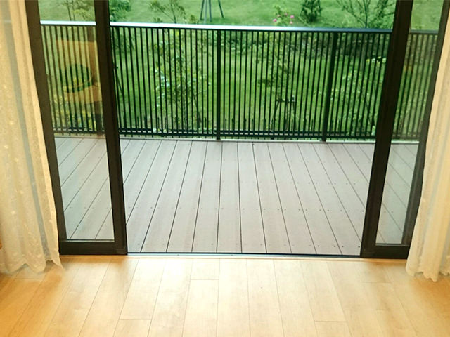 今回は、人工木材で明るいベージュ色でベランダ一面に施工しました。フローリングがパイン系の明るい色味だったため、明るいウッドデッキ床面にすることでリビングが延びたような印象を与えます。もちろん床板方向をフローリングと同じ外向きに揃えています。