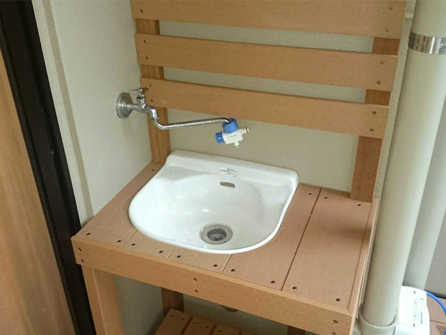 今回のマンションには水洗が外についているベランダで、施主様は水洗とその後ろにある壁が丸見えになっていることに抵抗感を感じていたので、目隠しを兼ねたものを作ってほしいとの要望がありました。水洗にはちょっとした大があると便利とのことで台を作成し、排水管の下には台を合わせて作成してあります。壁は直接見えないように、手前側に人工木材を飾り貼りし、焦点が壁に行かないようにしています。壁や床などに穴を開けなくても施工できますので、一度ご相談ください。