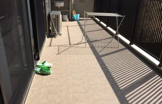 フラットな床面と室外機カバーなどが同じ人工木材で囲まれた落ち着いた雰囲気になりました。