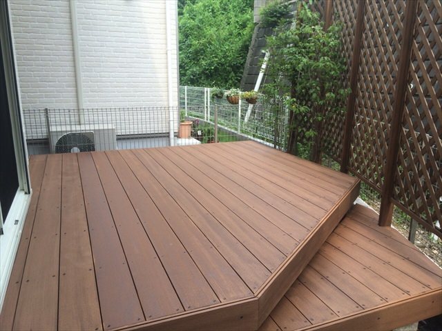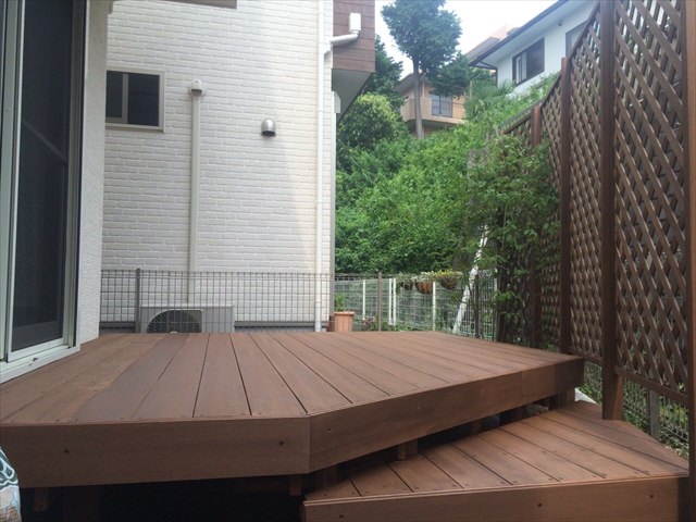 部屋から見える景色が、反り立つ擁壁で、げんなりする状態でした。それと外壁が家に対して平行でない多角形の庭だったため、色々と悩まれていたそうです。 今回は、床材・フェンス材ともに人工木材(アールウッド)で作成することになり…..