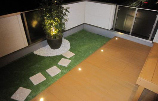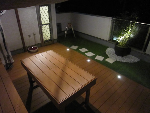 いえばナイトタイムも楽しめるLEDデッキ埋め込みライトと鉢には