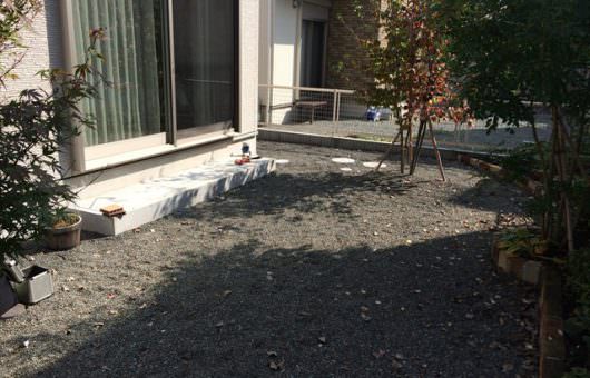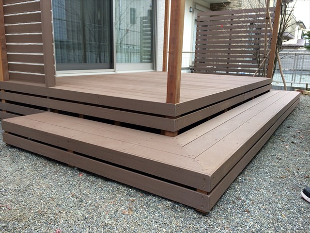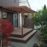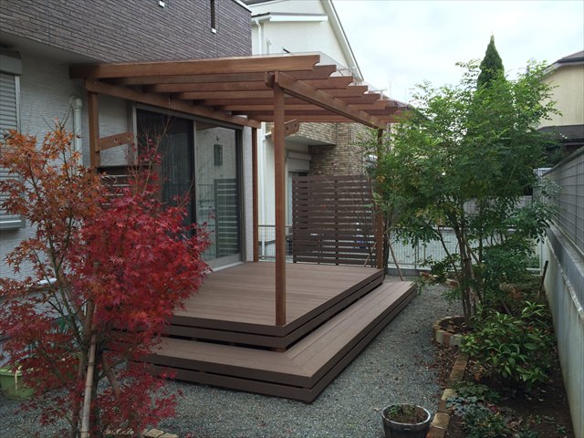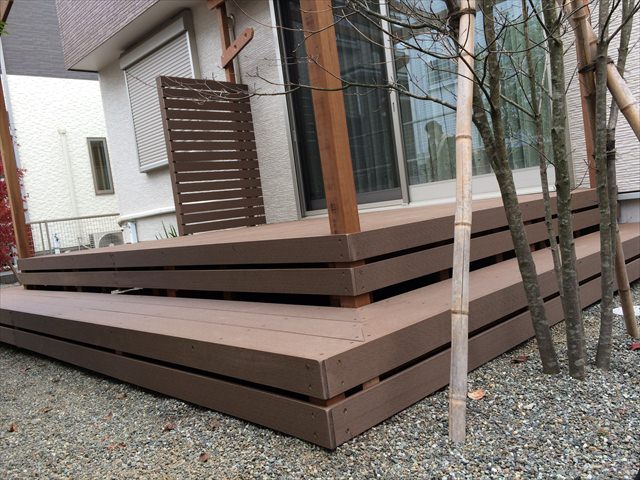 砂利敷きで植栽などもある落ち着いたイメージをそのまま崩さないような人工木材のブラウンを使ったウッドデッキは、存在感をあらわしつつ、主張しすぎない感じになっています。