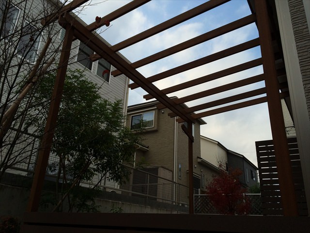 パーゴラに関しては、日差しの強い夏場に効果を発揮します。直射日光を和らげ、パーゴラ下には適時日陰を作るため気温も下がります。桟木と桟木の間隔を詰めすぎないことで、冬場の暖かい日差しも遮らないようになっています。ポリカーボーネート屋根もオプションしているので、出ることも可能です。